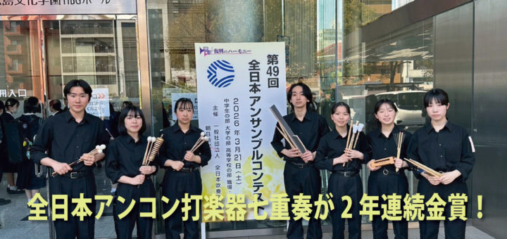 本日、広島文化学園HBGホールにて開催されました全日本アンサンブルコンテストにおきまして、打楽器七重奏が昨年に引き続き金賞を受賞いたしました。 皆さまの温かいご...
